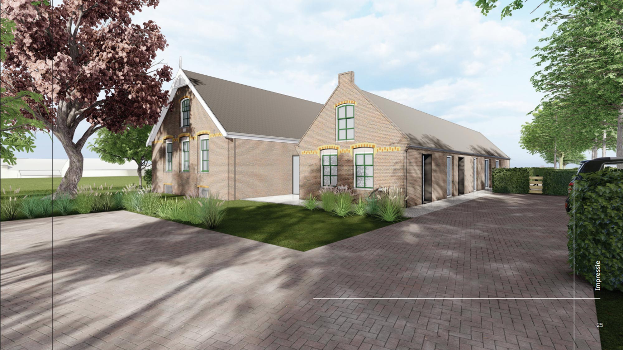 Impressie van het nieuwe ontwerp voor het boerenijencomplex met de boerderij en zomerhuis vooraan het erf en de twee nieuwbouwschuurwoningen achter op het erf. Enzo Architecten