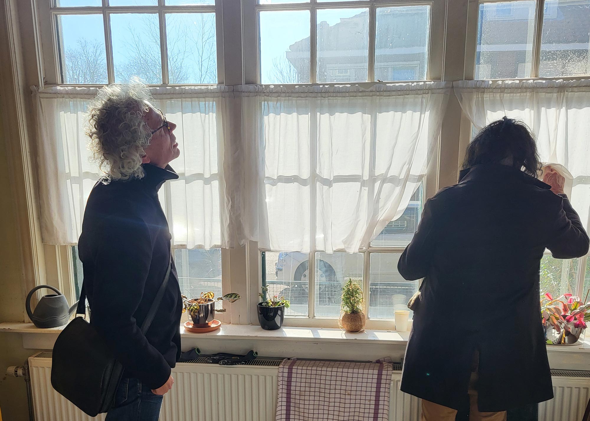 De commissie op locatiebezoek bij Groenelaan 69. Commissieleden Kees en Marcel bekijken de huidige staat van de ramen n.a.v. de vraag om de ramen te vervangen en dubbel glas toe te passen. Bron: MOOI Noord-Holland