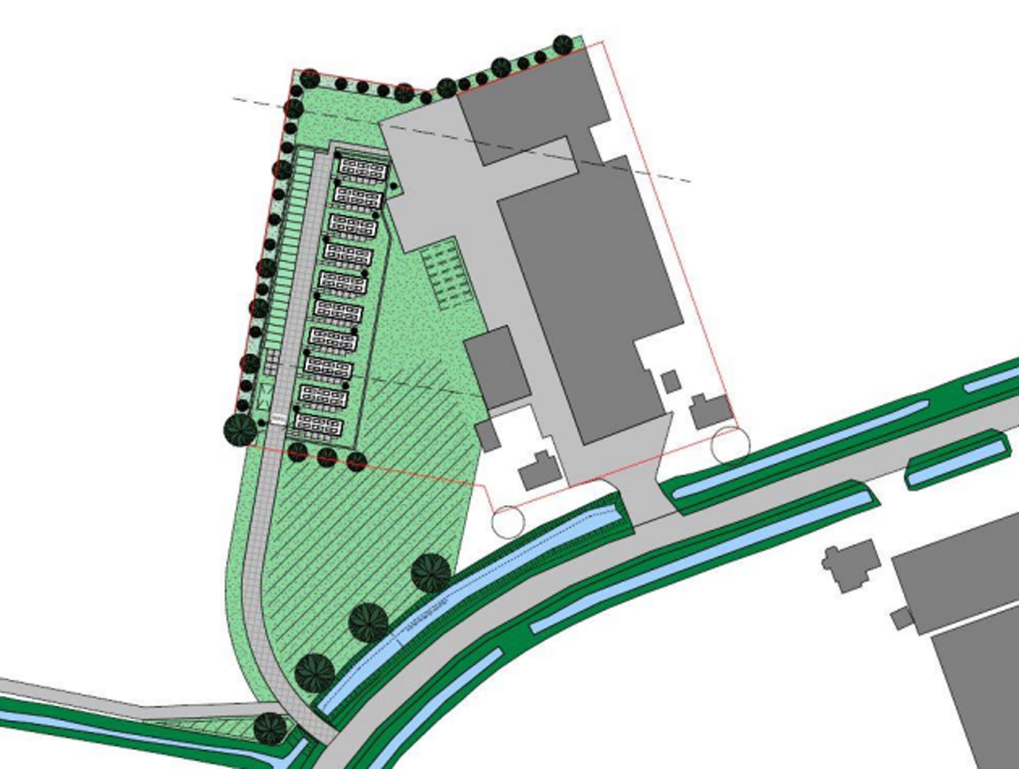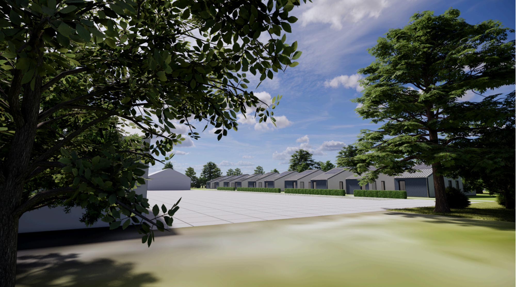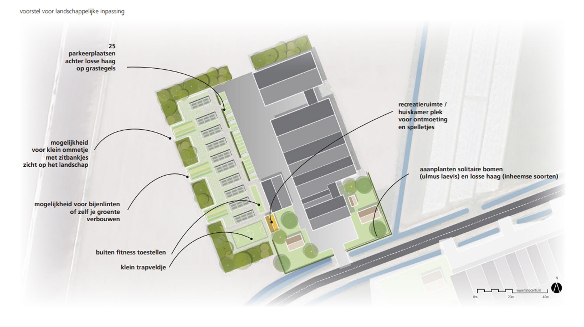 Eerste voorstel voor de landscahppelijke inpassing van de units. Edifice