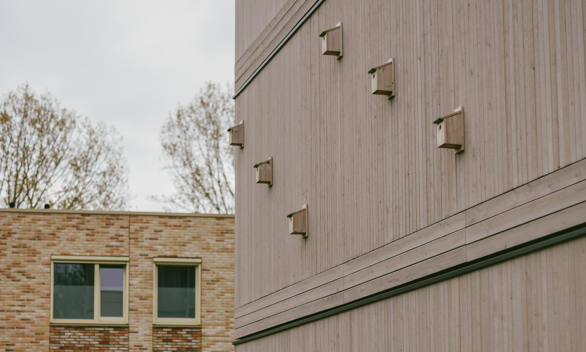 Fabrieksmatige woningbouw in De Klamp, Heerhugowaard, met nestkastjes toegevoegd aan de gevel. MOOI Noord-Holland