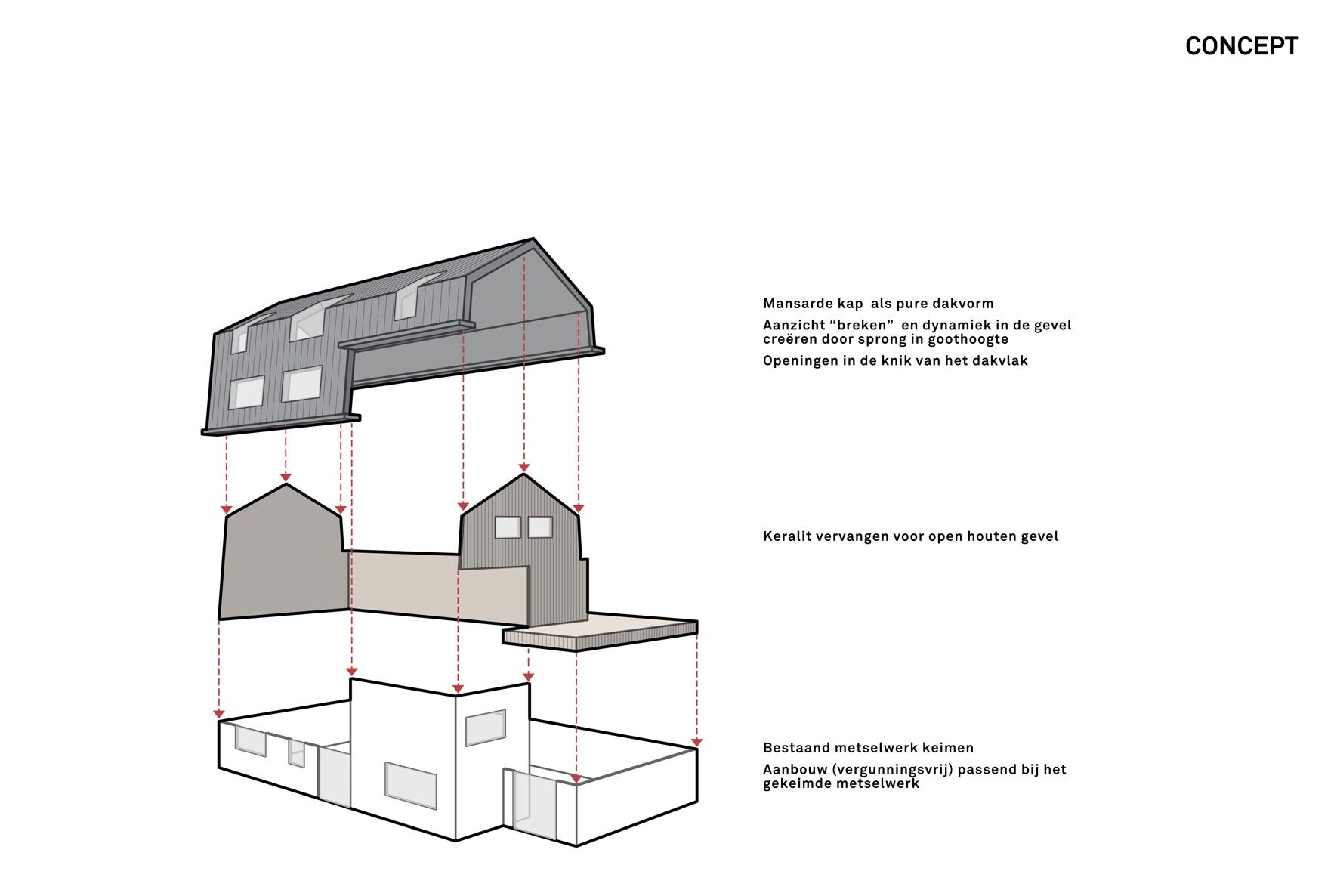 De bestaande vrijstaande woning is inclusief souterrain drie verdiepingen hoog met kap. De kap wordt aanzienlijk verhoogd om ook in de kap appartementen te kunnen maken. Hiervoor wordt het zadeldak vervangen door een mansardekap zodat dakkapellen niet nodig zijn en het beeld rustig en eenduidig blijft. De mansardekap past bij de woningen aan de overzijde van de straat die ook mansardekappen hebben.