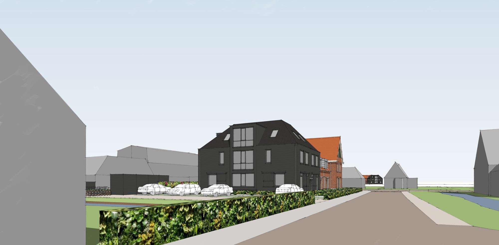 Ontwerp voor de te bouwen woningen gezien vanaf de Kerkebreek. Van Manen architecten