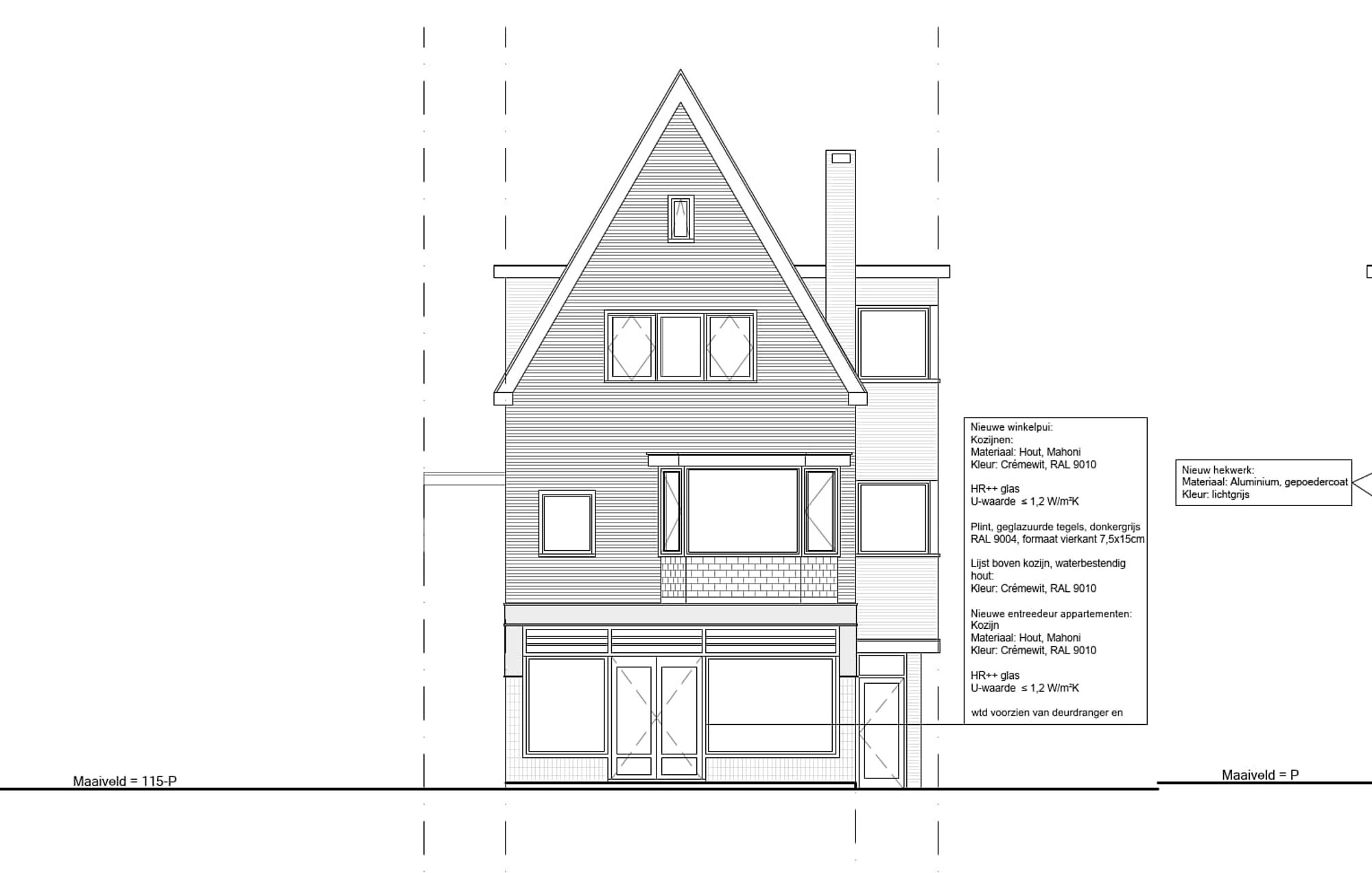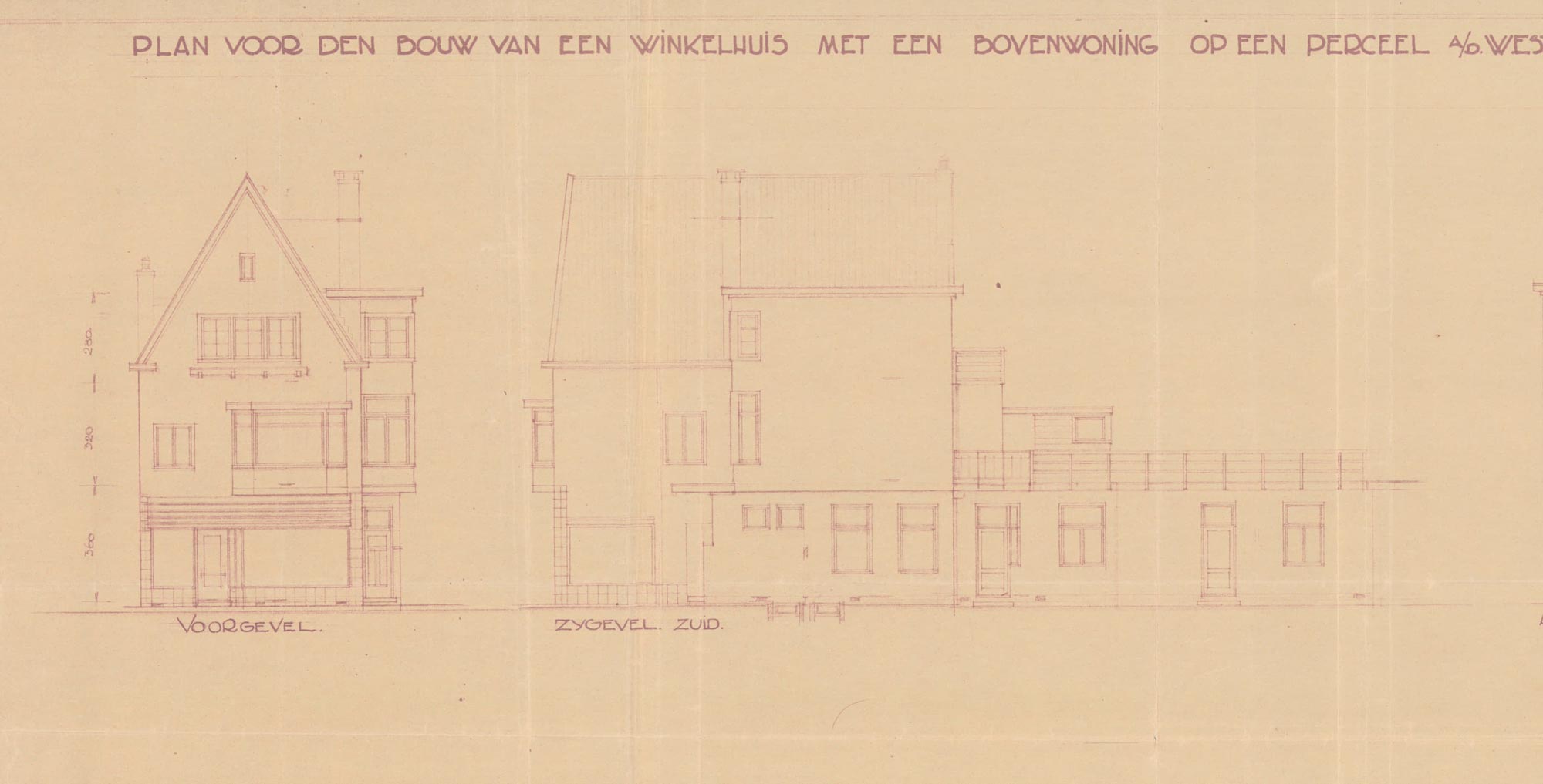 Af en toe besluit de gemandateerde architect om een plan mee te nemen naar de grote commissie. Westzijde 112 is een voorbeeld van zo’n plan. De aanvraag betrof het vervangen van de bestaande winkelpui en het realiseren van vier appartementen op de bovengelegen verdiepingen. Het aanvankelijke ontwerp voor de plint ging uit van een zwarte aluminium schuifpui en een donkergrijze houten toegangsdeur voor de bovenwoningen. Het witte plaatmateriaal boven de pui zou behouden blijven. De commissie adviseerde om een integraal ontwerp te maken voor de totale voorgevel om de eenheid tussen plint en bovenbouw te herstellen. De bouwtekening van het oorspronkelijke gevelontwerp uit 1933 werd daarbij meegegeven ter inspiratie. De commissie heeft waardering voor de wijze waarop de opmerkingen zijn verwerkt in het nieuwe ontwerp, zoals de plint en penanten van geglazuurde tegels, de crème witte kleur van de pui en entreedeur en de houten lijsten boven de kozijnen. Daarmee levert het plan een bijdrage aan de omgevingskwaliteit van dit bijzonder gewogen welstandsgebied.